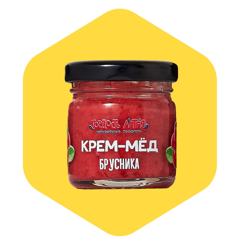 Крем-мёд с брусникой — это натуральный десерт на основе цветочного мёда из Алтая с добавлением настоящей брусники. Ягода придаёт мёду освежающий вкус с характерной кислинкой, мягкий ягодный аромат и насыщенный оттенок. Продукт изготавливается по технологии холодного взбивания, благодаря чему мёд сохраняет кремовую консистенцию, легко намазывается и долго не засахаривается. В составе используется лиофилизированная брусника или измельчённые ягоды — без добавления сахара, красителей, ароматизаторов и консервантов. Продукт выпускается только под заказ, что позволяет сохранить его свежесть, адаптировать упаковку под нужды клиента и использовать как для розничной торговли, так и в подарочной упаковке.